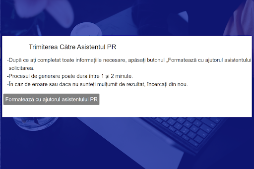 După ce ai completat toate informațiile necesare, apasă butonul Formatează cu ajutorul asistentului PR pentru a procesa solicitarea.